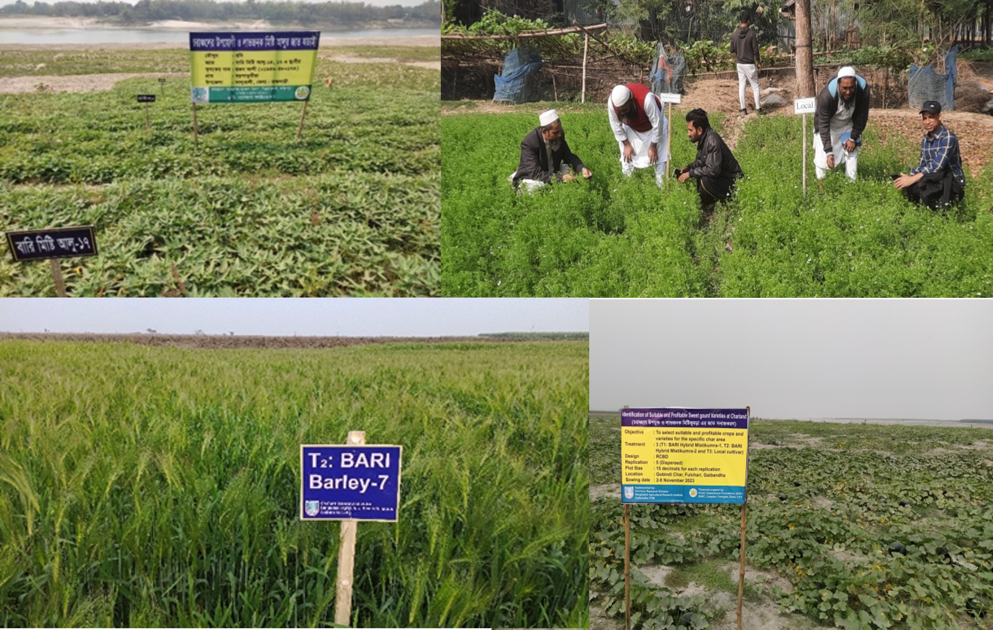 The research work was initiated at Fulchari Char of Gaibandha; Char Raypur of Bogura; Paturia char and Naduar char of Rajbari; Char Basalia of Tangail; Char Thetrai of Kurigram; Char Komorpur of Pabna and Char belgachha & Naovangar char of Jamalpur District during 2023 to select suitable and profitable crops and varieties for the specific char area. Five suitable and profitable crops and three improved varieties of each crop were selected for the trial at each project location. In Gaibandha, barley, lentil, groundnut, pumpkin and onion crop were selected for the trial. In Rangpur, pumpkin, onion, grass pea, potato and mustard were selected for the trial. In Faridpur, grass pea, Chilli, mustard, sweet gourd, groundnut and onion were selected for the experiment. In Pabna, mustard, lentil, black cumin was chosen for the trial. In Tangail, groundnut, grass pea, wheat and barley were selected for the trial. In Bogura, sweet potato, lentil, onion, groundnut and sweet gourd were selected for the trial. In Jamalpur, Blackgram, mustard, onion, groundnut and sweet gourd were selected for the trial. A total of 13 different crops including pulse, oil seed, vegetables, tuber crops, spices and minor cereals were selected for this project. Suitable high yielding BARI developed varieties of different crop were included in the trial. Among the selected crops groundnut, pumpkin and onion was common for 5 project locations while mustard, grass pea and lentil was common for 3-4 project locations. Five (5) farmers were selected for each crop in the working area and each farmer was treated as one replication. About seventy-five (75) decimal areas were cultivated under each crop including three varieties under this research work. The seeds of lentil, groundnut, pumpkin, onion, grass pea, mustard, barley, potato, wheat, black gram and black cumin were sown on October 30 to November 15, October 22 to November 21, November 2-21, November 5-27, November 9-21, November 8-23, November 6-21, November 29, November 6-21, September 10-18 and November 9-11 respectively across the locations. Different project related activities such as farmers and land selection, crop selection, input (seeds, fertilizer, pesticides) collection was done based on discussion with farmers and frequent visit of OFRD and RARS Team at the selected char locations. Seeds of BARI varieties of different crops were collected from BADC and respective crop centres of BARI. Seeds of local varieties were collected from progressive farmers and local seed dealers. All cooperator farmers of each project location were oriented with the project activities by the respective OFRD and RARS, BARI Team.